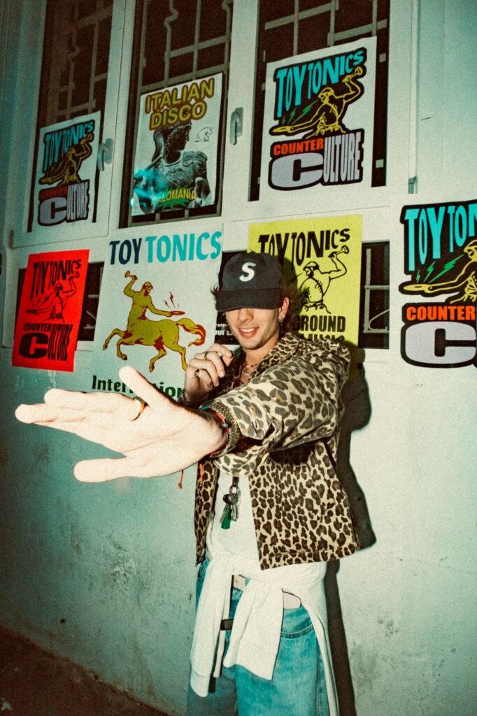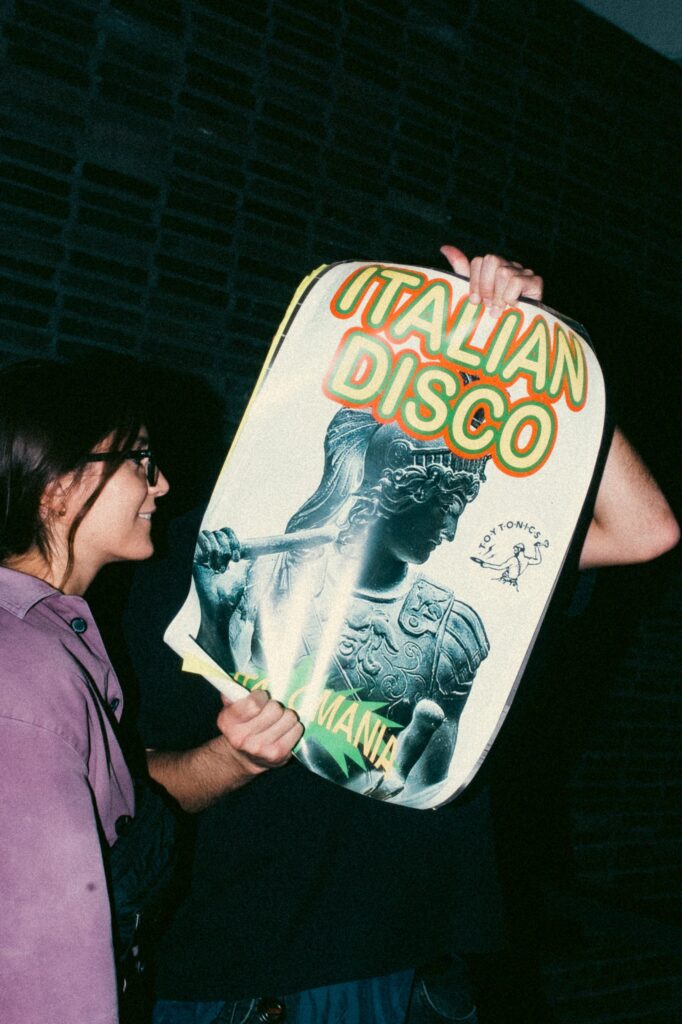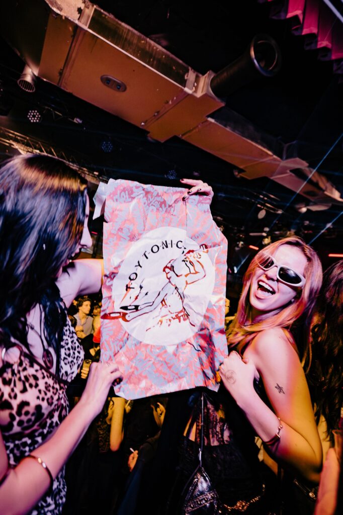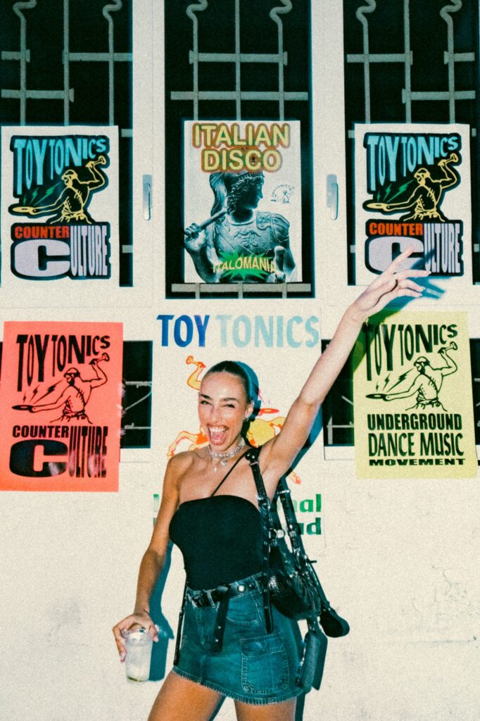The story begins on the dancefloor, plunging the viewer into the heart of Toy Tonics’ community – one filled with art students, designers, young creatives, and DIY fashion kids – the kind of crowd that mirrors the brand’s aesthetic. With its playful artwork and streetwear, Toy Tonics has naturally become a magnet for the creative world beyond club culture, hosting pop-up art events in Barcelona, Milan, and Berlin; collaborating with LN-CC during London Fashion Week; exhibiting at Villa Stuck (Munich) and Palais de Tokyo (Paris); and, since 2023, hosting the official Design Week Milano party – drawing thousands of attendees.