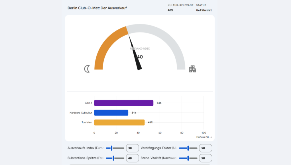 Das Dashboard zeigt uns eigentlich nur eins: Man kann die Regler schieben, wie man will – am Ende ist es ein Nullsummenspiel, solange wir versuchen, Clubkultur als reines Wirtschaftsgut zu optimieren. Sobald der Score für die Touristen bei 100 steht, ist die Stadt als kreativer Pol tot. Viel Spaß beim Schieben.